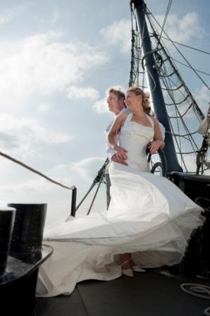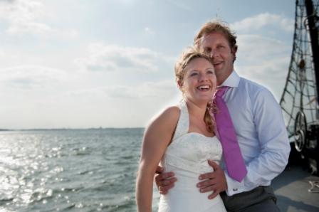 Een aantal van onze schepen zijn officieel trouwlocatie van de gemeente Muiden. De huwelijksvoltrekking kan zowel boven- als benedendeks plaatsvinden terwijl het schip aan de wal ligt. Maar trouwen op open water kan ook. Zodra het officiële gedeelte ten einde is, gaan de zeilen omhoog en kan het ontspannen deel van de bruiloft beginnen. De intieme sfeer aan boord, de omgeving en het water, maken er een dag van die niet alleen voor de bruid en bruidegom onvergetelijk is, maar voor alle gasten! Natuurlijk kan het schip ook voor de wal blijven liggen en dienen als locatie voor uw bruiloft receptie.