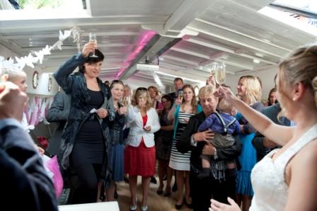 De boot ligt in de haven van Muiden. De bruidsgasten zijn al aan boord van het schip en staan klaar om het bruidspaar welkom te heten. Rond 14.00 uur komt het bruidspaar aan bij het schip.